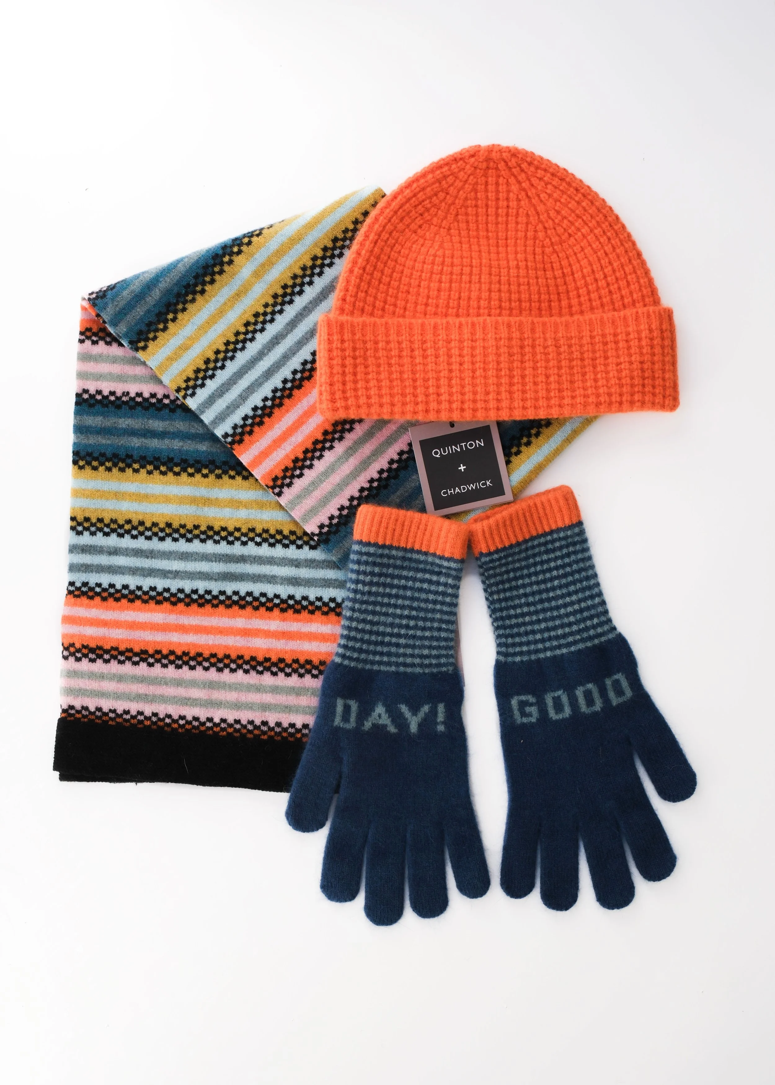 This hat and mittens have a gorgeous fluffy quality for being knitted with super soft Angora yarns. The gloves are fun and match perfectly with the small striped scarf in warm camel and soft grey blue tones